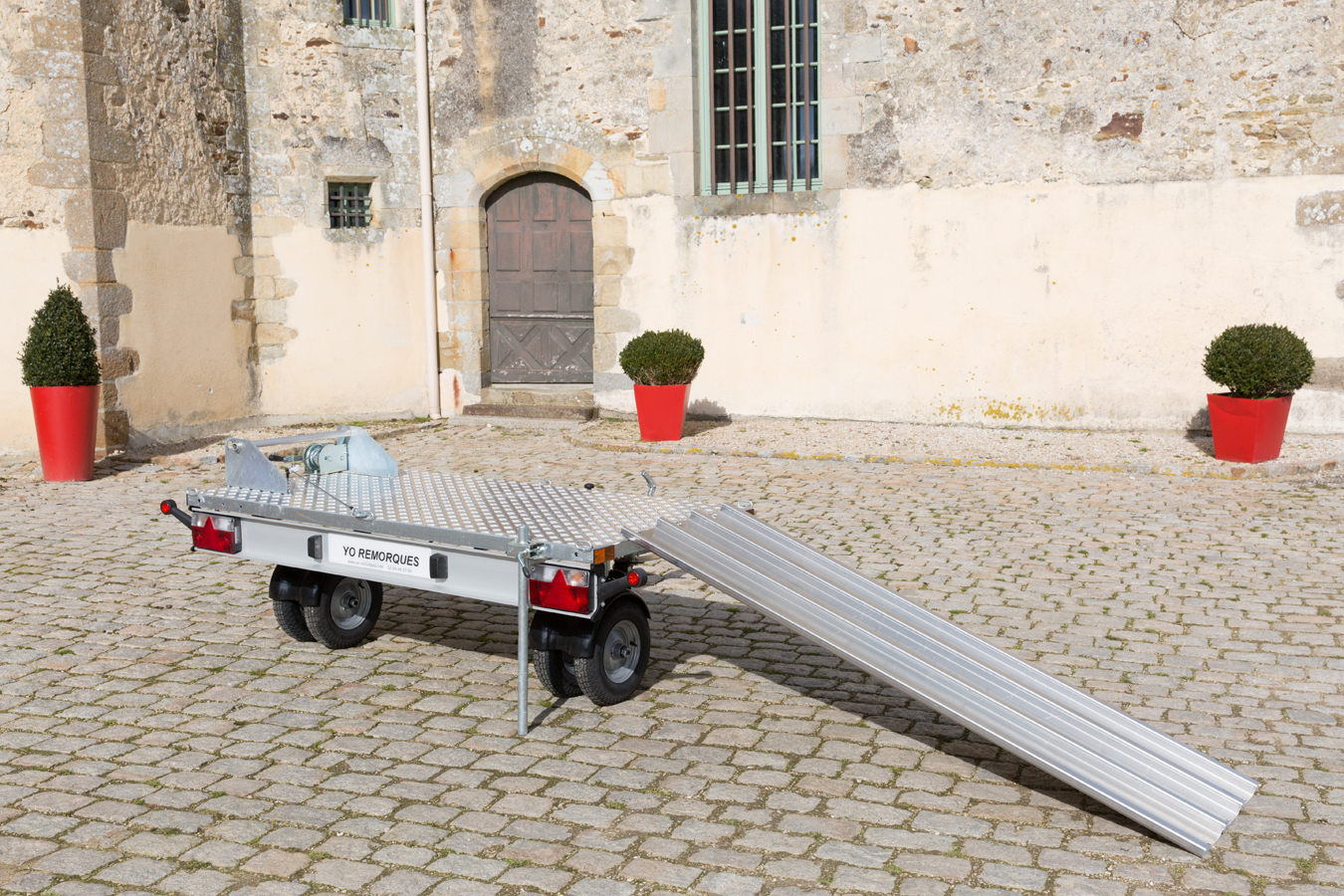 Les remorques transversales YO sont les seules remorques de ce type homologuées pour la conduite sur route en Europe. En plus de cela, ce sont les seules remorques transversales qui disposent d’un seuil de chargement abaissable fonctionnel et parfaitement adapté au chargement facilité de scooters, petites motos ou cyclos sur le marché.