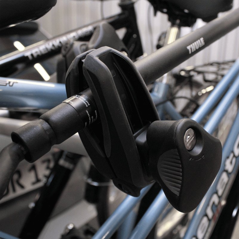 Les vélos sont fermement maintenus au niveau des roues par des courroies crantées résistantes et sur les cadres par des bras de fixation réglables et dont les mâchoires sont verrouillables à clé.